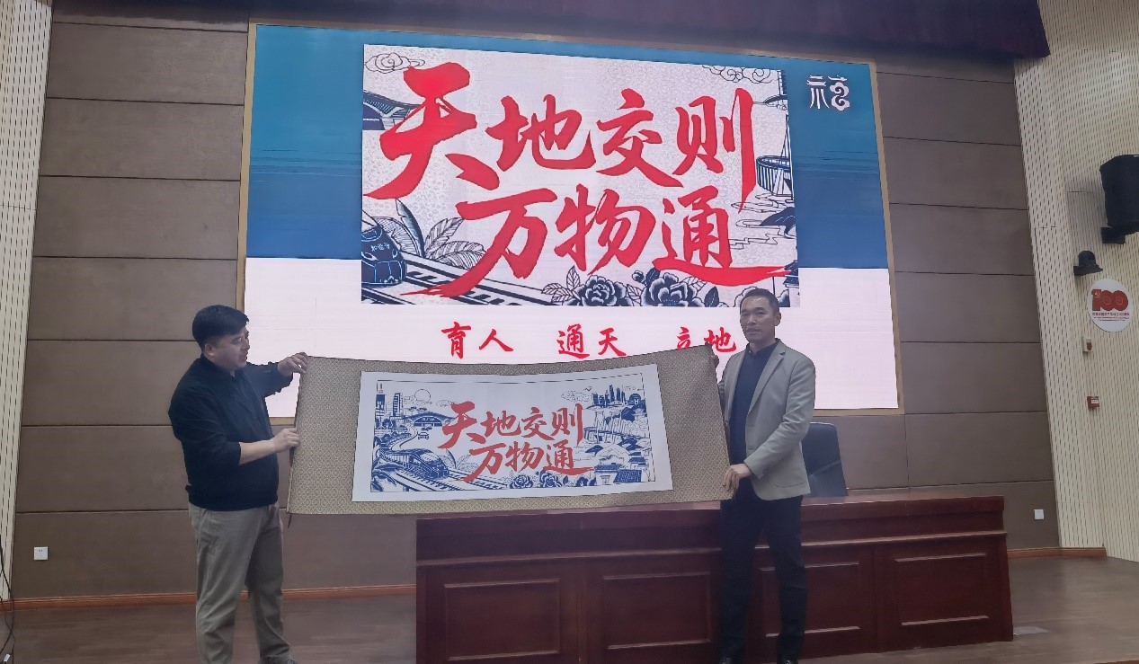 讲座最后,刘斌向学院赠送了一幅非遗剪纸作品《天地交则万物通》,以此表达对母校深切的感恩之情,亦寄托了对学院未来发展的殷切期望。作品以“交通”为意象,寓意天地相通、万物互联,既呼应交通人的专业使命,也象征着校友与母校之间深厚而持久的情感纽带。这份心意深厚的礼物,不仅承载着校友的祝福,也激励着在校师生继续秉承学院精神,在服务国家建设的道路上不断前行。