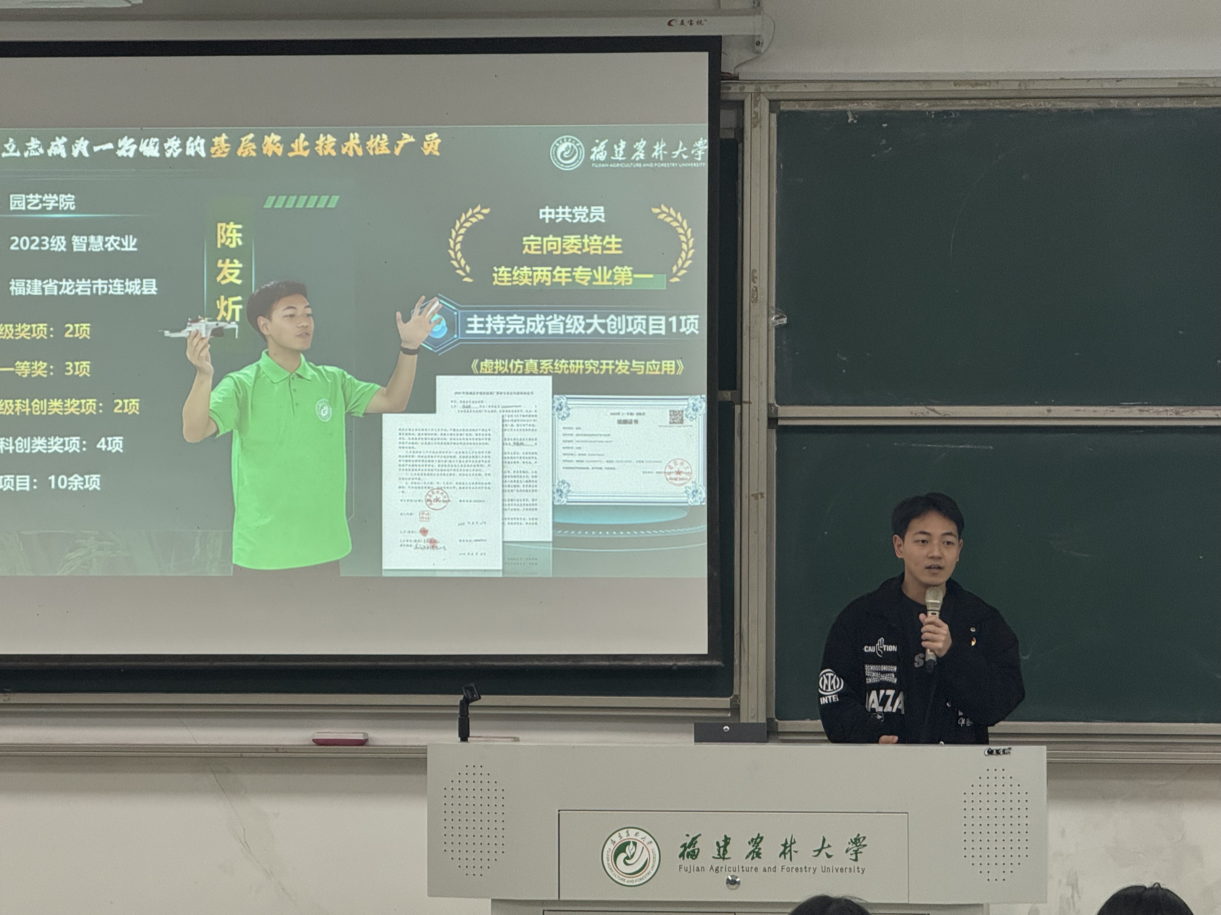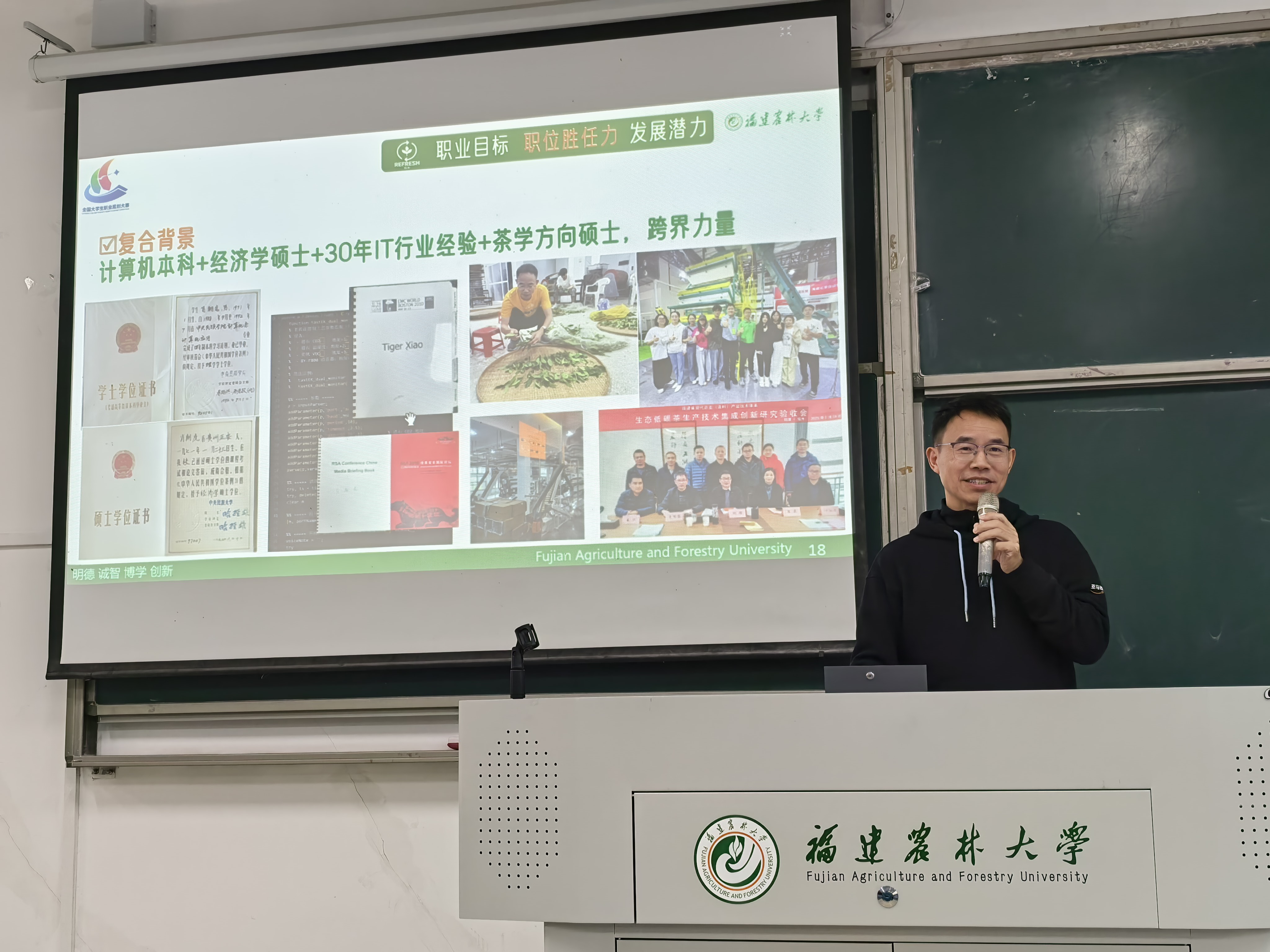 园艺学院2022级定向委培生陈发炘以《根植沃土承初心,智耕家乡践使命》为题,以“基层农业技术推广员”为目标,讲述其投身基层农技推广的志向。他结合在23个乡镇的实践经历,聚焦家乡奈李产业技术需求,参与智慧节水灌溉等项目,立志“把论文写在田野上,把成果留在农民家”。来自蜂学学院的王子敬以“蜂产品开发工程师”为目标,梳理了科研创新与产业融合的职业发展路径,分享了自己在蜂产品研发、品质提升等方面的探索经验。拥有计算机学士、经济学硕士及农学硕士(在读)背景的肖朝虎,曾任职北京某公关公司副总裁,服务过戴尔、亚马逊等世界500强企业。如今,他转向茶产业,以“智慧制茶战略规划师”为目标,补修专业课程、开展科研,成功研发“茶叶加工挥发性气体在线监测平台”,并赴福建、广西、贵州等地开展茶产业调研与AI技术推广,助力传统农业智能化转型,其跨界赋能农业的经历让现场学子深受启发。