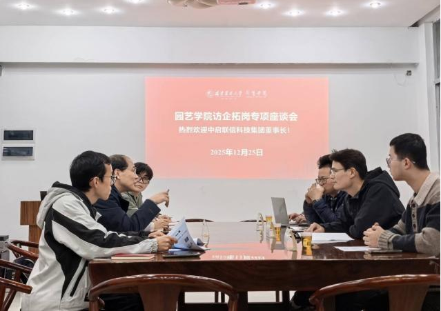 2025年12月25日,园艺学院在园艺楼109会议室开展访企拓岗专项座谈会。中启联信科技集团有限公司董事长辜俊杰、市场营销总监王传华、经理林子博、售前经理叶炜一行到访交流。学院副院长钟凤林、智慧农业系教师鲁军阳、毕业生辅导员罗冰筠、曾泽群共同参会。会议由钟凤林主持。
