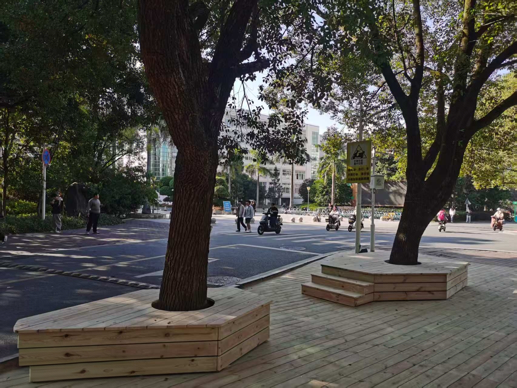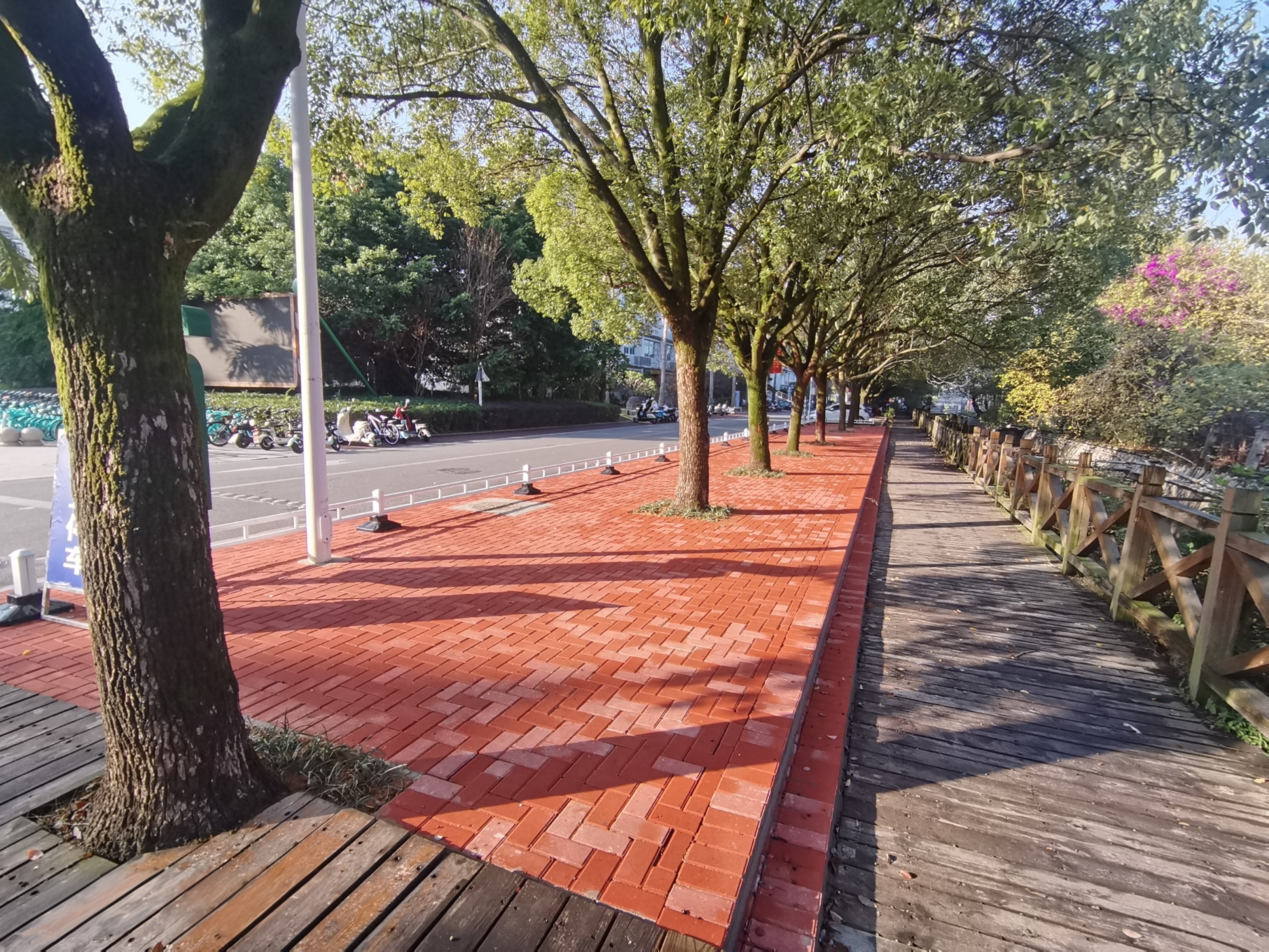 优化路口功能布局,将西芹路西路口(创新楼前)改造为红砖人行道,东侧空地铺设木栈道,与原有木栈道无缝衔接,形成整体通行廊道,既极大改善了师生上下课高峰期路口拥堵状况,确保行走安全和通行顺畅,更让该路段景观风貌愈发协调雅致,为校园增添了一抹灵动景色。