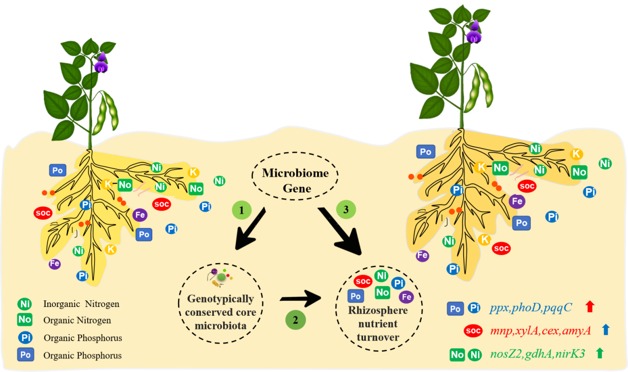 作物基因型和微生物驱动的根际过程,决定了根际养分的有效性,进而影响作物的养分效率和作物生产力。作为粮、油、饲多功能的豆科作物,大豆不仅提供了蛋白、油分,还在农业生态系统维持和提高土壤肥力具有重要作用。然而大豆改善土壤的能力是否存在基因型上的差异,以及背后的遗传与根际微生态机制未被解析。