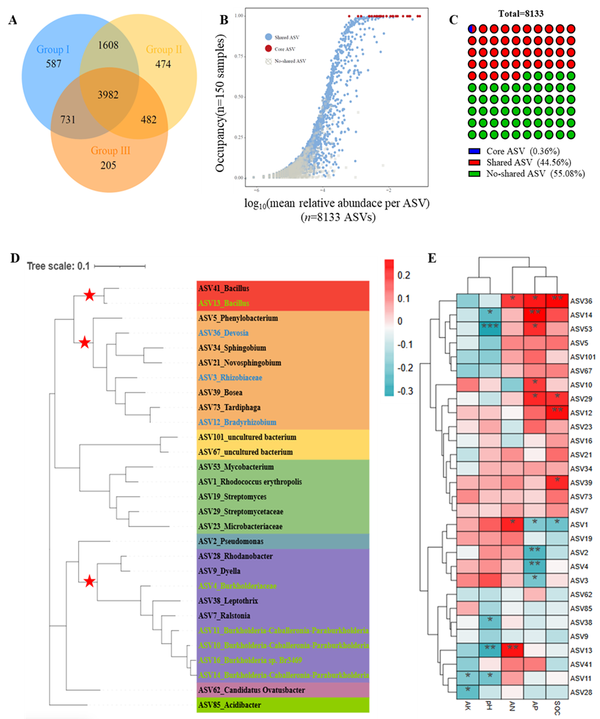 通过对大豆种质资源的根际核心微生物群分析,鉴定出29个系统发育保守的核心微生物(ASVs),其中大多数与根际养分有效性显著相关。值得注意的是,ASV13、ASV14和ASV12分别与根际土壤的碱解氮、有效磷和有机质呈显著正相关(图2)。随后,将这些核心微生物类群整合至一个以根瘤菌为核心的合成细菌群落中,进一步证实了系统发育保守的核心微生物能够驱动根际养分周转,进而提升宿主植物养分利用效率。