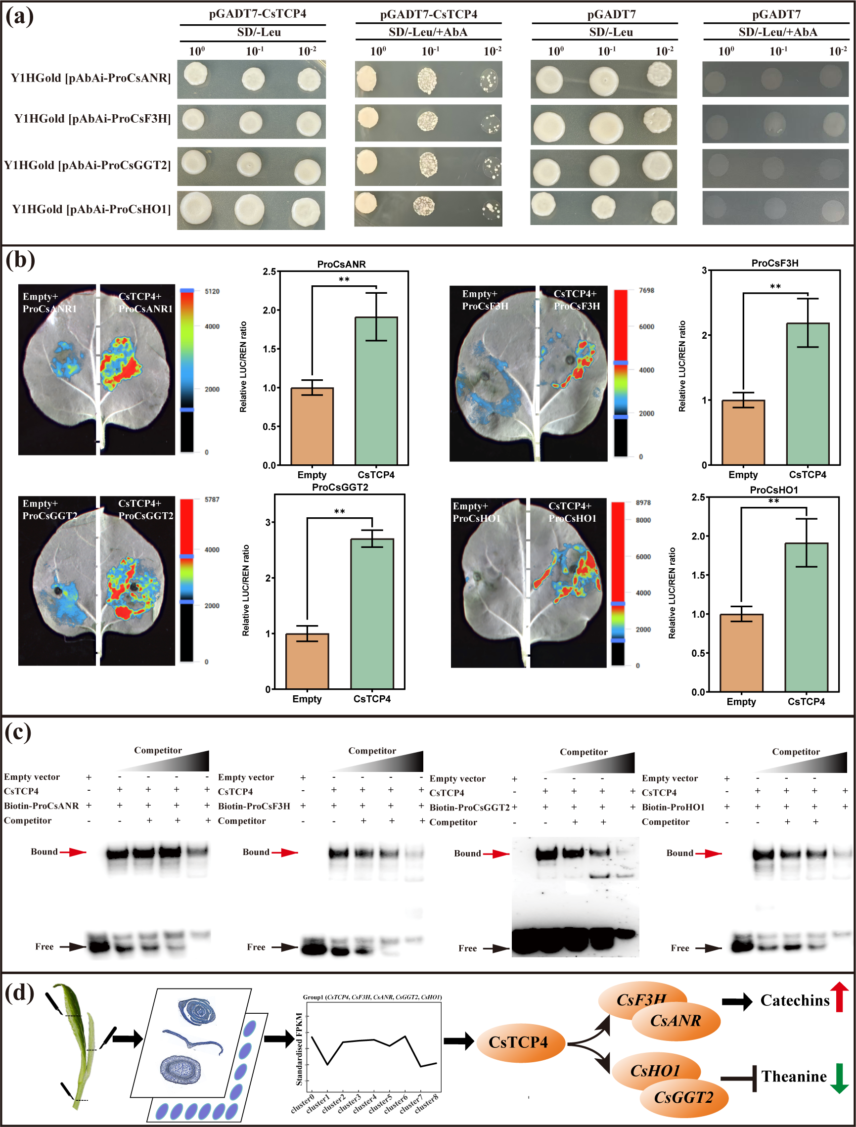 研究重点聚焦于茶树特征风味代谢物(儿茶素、茶氨酸、咖啡碱)生物合成与水解相关基因的空间表达模式。发现儿茶素合成关键基因(如CsANR、CsLAR、CsDFR)在芽及叶的维管束和海绵组织中高表达;茶氨酸水解基因CsGGT2在芽和叶的韧皮部、海绵组织及维管区域活跃;咖啡碱合成基因(如TCS)则在芽和叶的多个功能区域广泛表达。这揭示了这些代谢途径在组织空间上的协同与分工。基于“调控的空间决定性”原则,研究筛选出与上述代谢基因空间共表达的转录因子,并重点验证了转录因子CsTCP4的功能。通过反义寡核苷酸瞬时干扰实验、酵母单杂交、双荧光素酶报告基因及电泳迁移率变动分析证明,CsTCP4能直接结合并激活儿茶素合成基因(CsF3H、CsANR)和茶氨酸水解基因(CsGGT2、CsHO1)的启动子。功能上,CsTCP4正向调控儿茶素积累并促进茶氨酸降解,从而协同影响茶叶的“苦涩”与“鲜爽”风味平衡。
