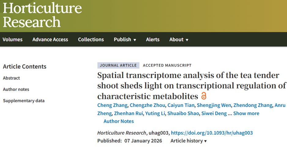 近日,开云网页版郭玉琼教授团队在国际期刊《园艺研究》(Horticulture Research)在线发表了题为“茶树嫩梢的空间转录组分析揭示了特征代谢物的转录调控(Spatial transcriptome analysis of the tea tender shoot sheds light on transcriptional regulation of characteristic metabolites)”研究论文,利用空间转录组技术,首次全面构建了茶树嫩梢(包含嫩茎、嫩叶和顶芽)的高分辨率空间基因表达图谱。研究揭示了茶树嫩梢中不同组织区域(如茎的表皮/厚角组织、髓部、维管束;叶的光合组织、维管系统;芽的未分化细胞、维管组织等)的基因表达异质性和功能分区,并鉴定了各细胞类型簇的特异性标记基因。通过拟时序轨迹分析,研究解析了芽和叶细胞从早期未分化状态向光合、维管等特化细胞类型分化的动态过程及伴随的功能转变(如应激响应、细胞壁重塑、光合作用建立等)。