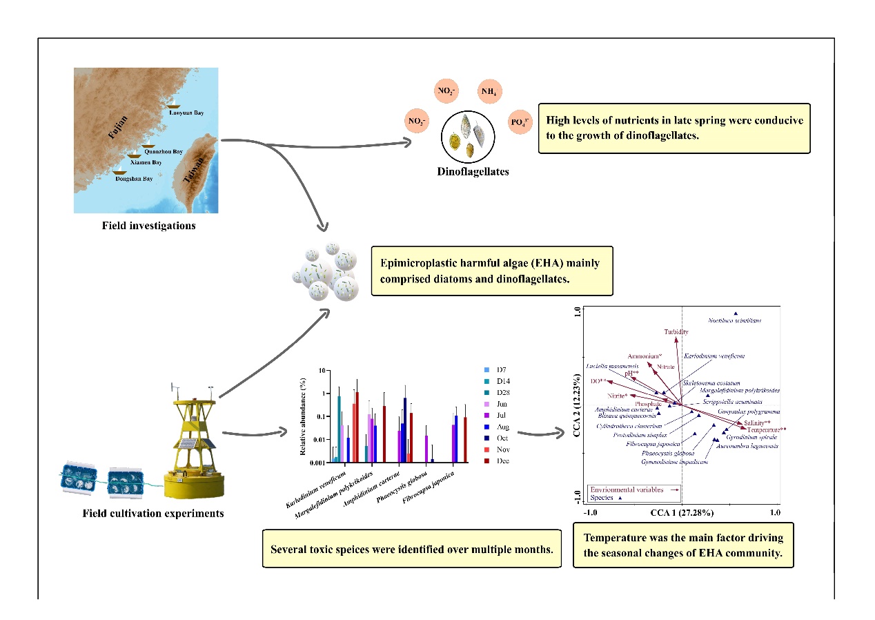 微塑料为有害藻类提供了稳定的栖息与扩散载体,并且可借助洋流和风力跨海域传播,增加了有害物种的潜在入侵风险,对近海养殖安全和生态系统稳定构成威胁。此前已有多项研究表明,微塑料(MPs)可能扩大有害藻类的空间分布并引发有害藻华(HABs)。但由于对微塑料附生有害藻类(EHA)的物种组成及其时空动态的认知不充分,限制了对EHA与MPs相互作用及其环境影响的深入探究。为此,本研究在中国东海四个半封闭海湾(东山湾、罗源湾、泉州湾、厦门湾)开展了野外调查与原位培养实验。结果显示,共鉴定出 41 种EHA藻类,主要为甲藻和硅藻(如剧毒卡尔藻、东海原甲藻、尖刺伪菱形藻等)。33%-60% 的EHA物种与浮游有害藻类存在重叠,暗示部分EHA可能来自外源输入。多元分析结果表明,部分甲藻丰度与营养盐(硝酸盐、铵盐等)和温度呈正相关,硅藻丰度则与温度呈负相关,这意味着在温暖、营养盐丰富的春季,EHA可能具有更高的环境风险。与其他研究不同,本研究中不同类型微塑料表面的EHA组成未显示出显著差异。值得注意的是,本研究发现的EHA物种中还包含一些中国罕见但在全球其他海域频繁引发有害藻华并造成大规模鱼类死亡的有毒物种(如强壮前沟藻、多环玛格丽夫藻等),这凸显了持续监测其在中国海域动态变化的必要性。