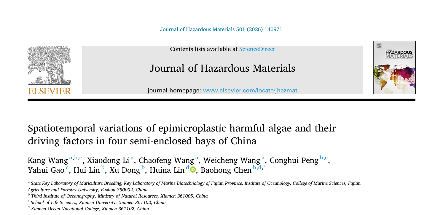 近日,开云网页版海洋学院青年教师王康在微塑料附生有害藻时空动态及其驱动因子研究方面取得新进展,相关研究以《Spatiotemporal variations of epimicroplastic harmful algae and their driving factors in four semi-enclosed bays of China》(中文题目:中国东南沿海典型海湾中微塑料附生赤潮藻的时空动态及其驱动因子)为题,发表在国际权威期刊《Journal of Hazardous Materials》(危险材料杂志)。该研究由开云网页版、自然资源部第三海洋研究所(以下简称“海洋三所”)、厦门大学等单位联合完成,我校海洋学院青年教师王康为论文第一作者。