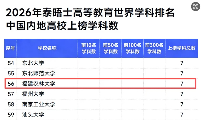我校表现亮眼,共有7个学科成功上榜,上榜学科数量稳居入榜的全国农林高校首位,与福州大学并列位居省属高校首位,同时并列位居中国内地高校第34位,彰显了我校在学科建设领域的强劲实力与稳步提升的综合影响力。这7个学科分别为:生命科学、医学与健康、理学、工学、商业与经济学、社会科学和计算机科学。这些学科领域覆盖面广、交叉性强,充分体现了我校多学科协同发展的良好格局。