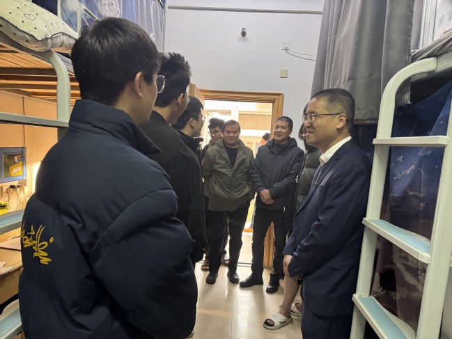在鹿鸣苑3号楼120宿舍,检查组提醒留校准备公务员、选调生考试的同学要注意人身和财产安全,特别要注意用电安全,离校时要关好门窗,预祝同学们考试顺利,过一个平安、祥和、愉快的假期。