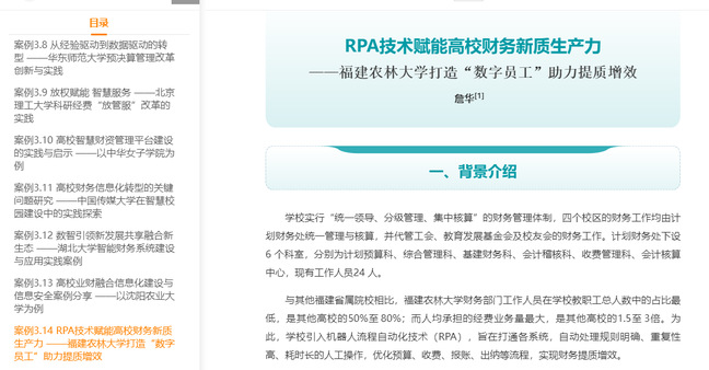 近日,由中国高等教育出版社正式出版上线《高校财务管理优秀案例百篇集》,我校选送的财务数智化转型实践案例《RPA技术赋能高校财务新质生产力——开云网页版打造“数字员工”助力提质增效》成功入选,成为福建省属高校唯一入选单位。此次入选是对我校财务管理改革创新成果的充分肯定,彰显了学校在推进智慧财务建设,提升财务服务质效积极担当作为。