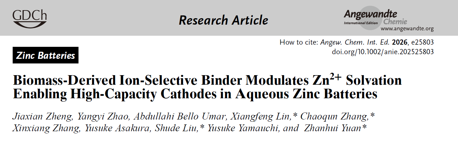 近日,开云网页版材料工程学院袁占辉教授团队在国际顶级期刊《Angewandte Chemie International Edition》(德国应用化学)在线发表了题为“Biomass-Derived Ion-Selective Binder Modulates Zn2+ Solvation Enabling High-Capacity Cathodes in Aqueous Zinc Batteries”(生物质衍生离子选择性粘结剂调控Zn2+溶剂化结构构建水系锌电池高容量正极)的研究论文。上述研究进展是袁占辉教授团队在生物质水系电池材料基础研究方面的重要突破。此前,袁占辉教授团队成员在生物质水系锌电池隔膜设计(Energy Environ. Sci., 2025, 18, 5457;Mater. Horiz., 2025, 12, 6252;Adv. Compos. Hybrid. Mater., 2025,8, 217; 中国造纸学报, 2025, 40,151-160)、锌负极保护涂层(Chem. Eng. J., 2026,527,172018)和正极材料(Nano Lett., 2025,https://doi.org/10.1021/acs.nanolett.5c05008)设计方面取得了系列进展。基于上述工作,本研究提出了一种新型ι-卡拉胶(CAG)粘结剂用于二次水系金属电池电极材料的制备,通过模拟细胞离子通道功能,实现选择性离子配位和溶剂化结构调控,显著提高电池容量。