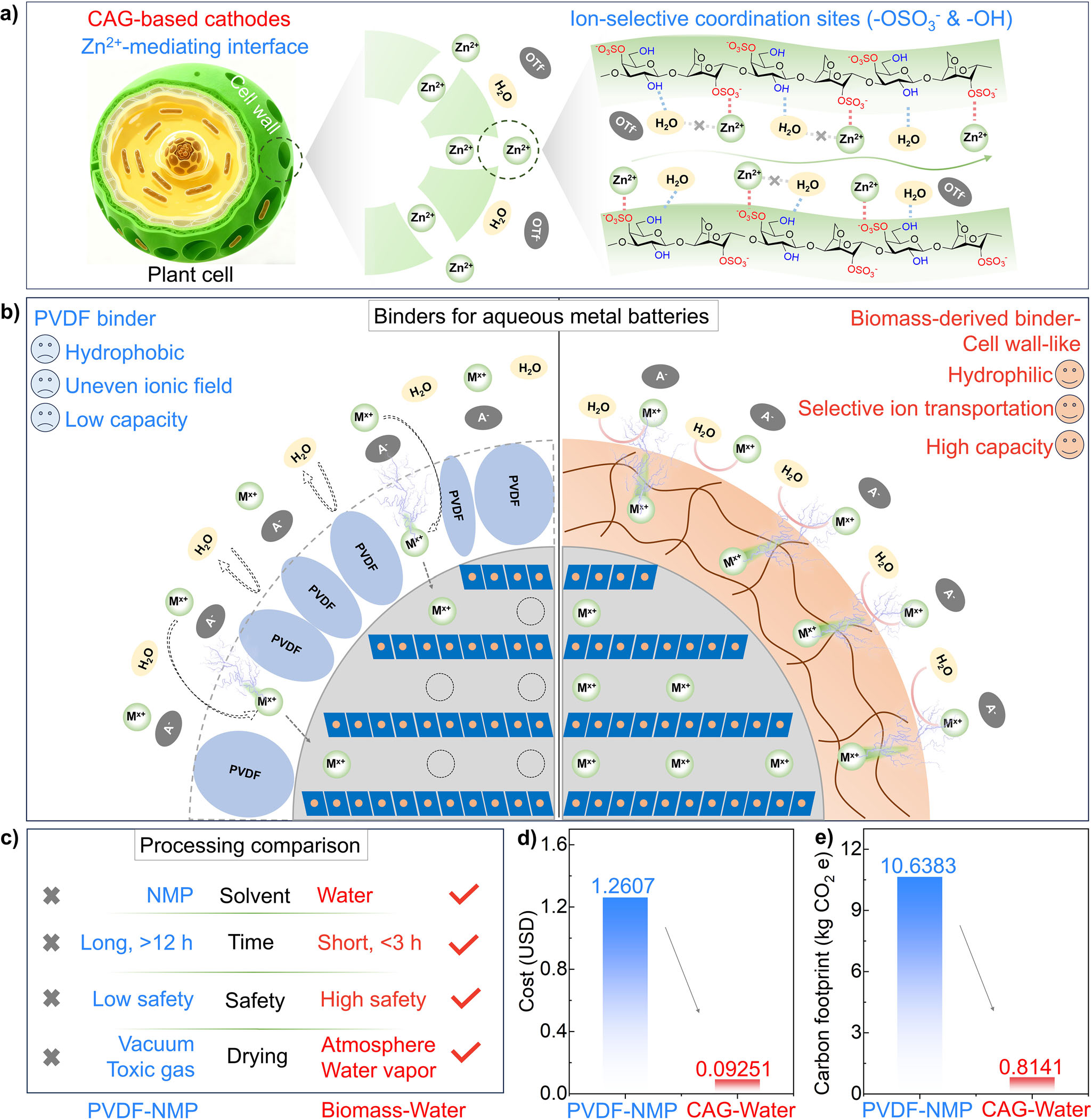 二次水系金属电池因其安全、低成本和环境友好引起了广泛的关注。聚偏氟乙烯(PVDF)是水系电池正极材料制备过程的常用粘结剂。然而,PVDF依靠弱范德华力来粘合活性材料和集流体,导致其在循环过程中结构稳定性不足。其次,在水系电解质环境中,PVDF的疏水性阻碍了电解液的有效渗透以及与正极材料的接触,降低了正极活性材料的利用率和电池容量。此外,PVDF粘结剂需要使用有机溶剂(N-甲基吡咯烷酮)才能与活性物种和导电剂均匀混合,这给水系电池正极制备过程的环保、安全和成本带来了额外的挑战。因此,粘结剂对于水系电池的性能和加工成本有重要的影响。