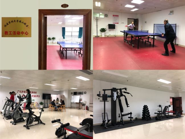 活动中心现设有乒乓球、台球、棋牌、健身、谈心和自助服务等多功能活动区域,总面积约280平方米,先后投入约10万元配置了乒乓球桌、跑步机、综合训练器、象(围)棋、篮(排)球等20余种器材,此外还购置了微波炉、冰箱、音响等自助服务、多媒体设备,休闲桌椅、储物柜、置物架等家具一应俱全,为广大教职工日常生活服务、体育健身、休闲交流、切磋技艺等提供了的条件场所。