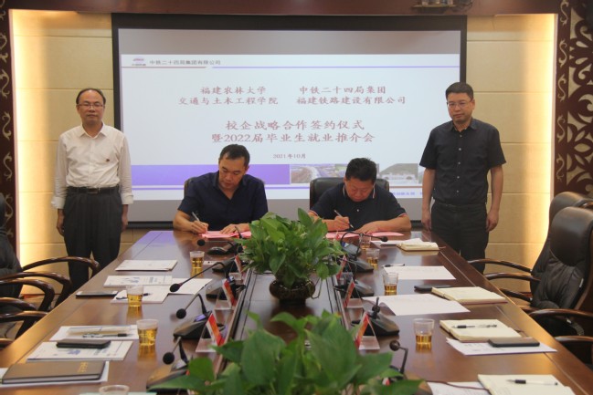 会议伊始,温裕洪介绍了中铁二十四局集团福建公司的基本概况,廖飞宇对学院基本概况做简要介绍,并对双方就人才培养、科研攻关和学生就业等方面深度合作表示真诚的期待。双方对校企战略合作事宜及2022届毕业生就业工作进行深入探讨之后,廖飞宇和张国春分别作为学院和企业代表进行签约并举行授牌仪式。
