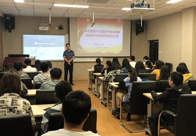 11月6日傍晚,本科生第一党支部、第二党支部和植物病理学科研究生第三党支部在博学楼704室联合召开主题党日,学院党委副书记丁喆以《学习党的十九届五中全会精神,做新时代教育改革的践行者》为题,为学生党员、全院学生党支部书记上党课,对《中共中央关于制定国民经济和社会发展第十四个五年规划和二〇三五年远景目标的建议》进行导读,结合高校实际着重讲解了提高社会文明程度、建设高质量教育体系、加强国家安全体系和能力建设、加强党中央集中统一领导等主要内容,同时,结合学生党建和思政工作实际,逐一讲解了《深化新时代教育评价改革总体方案》有关内容,并要求学生党支部和学生党员要增强政治自觉、思想自觉、行动自觉,学习领会好、宣传贯彻好党的十九届五中全会精神和新时代教育改革精神。
