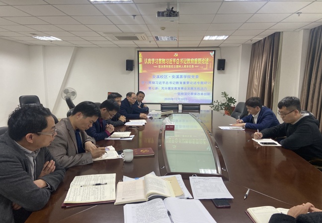 12月10日,安溪校区·安溪茶学院党委召开理论中心组扩大会议,开展学习贯彻习近平总书记教育重要论述第四次专题学习研讨,围绕“充分激发教育事业发展生机活力—坚持深化教育改革创新”这一主题进行学习研讨交流。校区·学院党委书记连文主持会议,中心组成员参加会议,校第三督查组组长、校党委组织部部长戴祐坤、组员陈达到会指导。