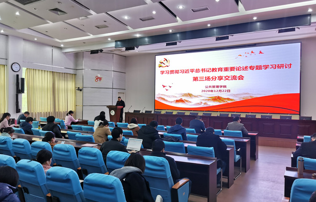12月22日下午,公共管理学院在禧强楼学术报告厅召开学习贯彻习近平总书记教育重要论述第三场专题分享交流会。学院5位教师代表围绕“好老师是民族的希望——坚持把教师队伍建设作为基础工作”主题,结合自己的思想、工作实际分享了学习体会。学院全体教职工参加分享交流会,副院长阮晓菁主持会议。
