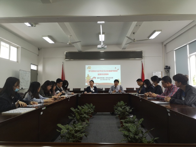 3月31日,国际学院第二学生党支部在明北附303召开会议学习贯彻习近平总书记在福建考察时的重要讲话精神。会议由支部书记王庆丰主持,支部全体党员参加了会议。