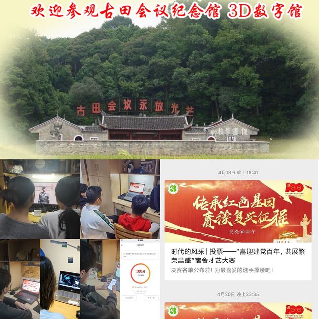 突出形式创新,别样学习。打造“互联网+党建”学习模式,发挥“福建是革命老区,党史事件多、红色资源多、革命先辈多”的独特优势,鼠标一点,智能游览古田会议纪念馆、谷文昌纪念馆等45个福建省爱国主义教育基地网上展馆,丰富爱国主义教育载体;利用学习强国、公众号、易班等融媒体平台,发布红色放映室等学习资源;组织一“马”当先知识竞赛、党史知识云答题和保密知识竞赛活动,利用辅导猫开展党史知识竞赛,做到学生学习全覆盖。