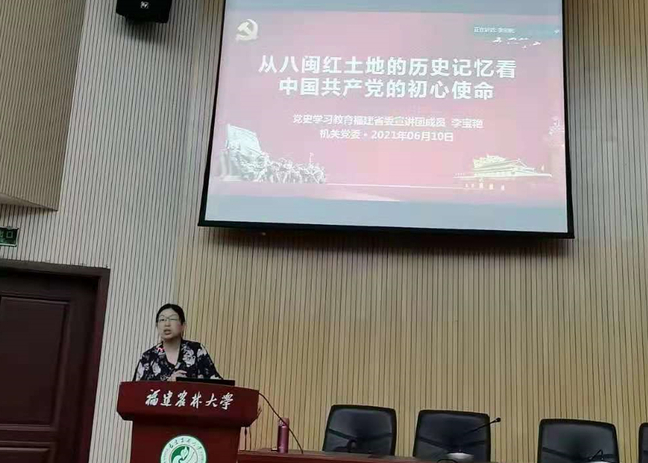 6月10日下午,机关党委在博学报告厅举办党史学习宣讲会,邀请党史学习教育福建省委宣讲团成员、马克思主义学院李宝艳教授作题为《从八闽红土地的历史记忆看中国共产党的初心使命》的宣讲报告。机关党员、干部共280多人参加了宣讲会。宣讲会由机关党委书记孙淑芹主持。