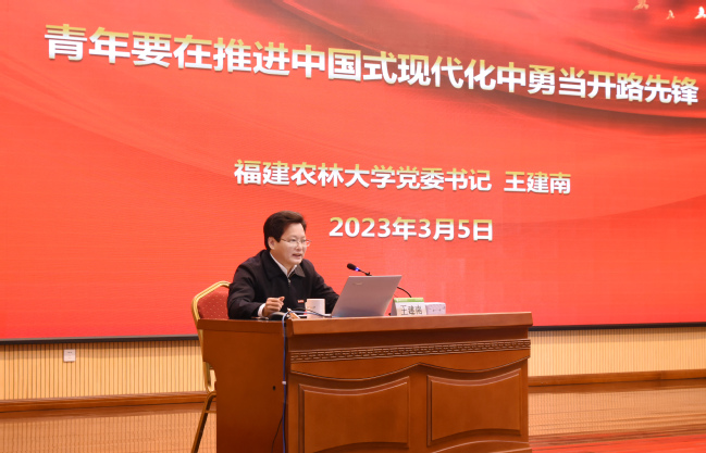 王建南强调,青年大学生是中国特色社会主义事业的建设者和接班人,承载着推进中华民族伟大复兴的历史使命,要找准新时代的历史方位,正确认识世界和中国发展大势,从实际出发找准自身定位,在推进中国式现代化中勇当开路先锋。他以林占熺、廖红教授等先进榜样为例,勉励青年大学生要认清历史机遇,正确认识世界之变、时代之变、历史之变;勇担时代重担,在担当中历练,在尽责中成长;练就过硬本领,用科学的理论武装头脑,用优秀的文化滋养身心,掌握先进的科学知识,培养创新精神和创新能力,提高实践能力,开拓国际视野,为推动农林科学技术创新发展而团结奋斗,共同汇聚起推进中国式现代化的磅礴力量。