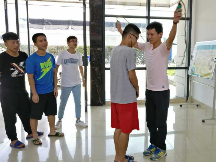 上午9:30,活动正式开始,参与活动的同学在起点处领取卡片后,凭卡片到到宿舍楼大厅游戏区参与游戏。位于二号楼宿舍楼大厅的穿越火线游戏很受学生欢迎,该游戏需两人配合,一人带着眼罩,听从另一个队友指挥,在不碰到“火线”(地面红线)的情况下完成穿越,即挑战成功。 除此之外,还有趣味乒乓球、不倒森林、纸杯传水、你说我猜等多种趣味游戏。2014级化学工程与工艺专业的学生王若宇参与了所有游戏,“游戏都非常有意思,我还叫舍友一起下来玩,希望以后假期还能有这样的活动。”