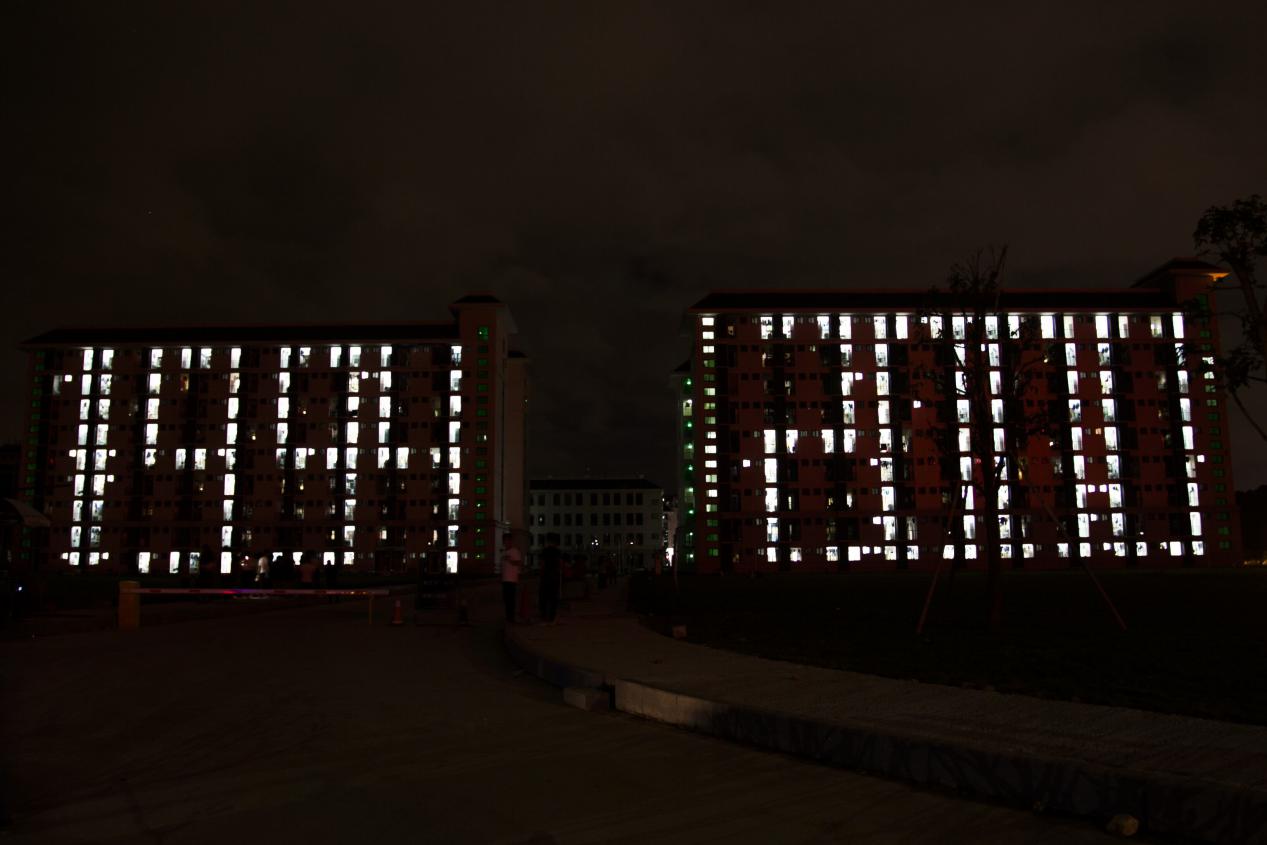 为了迎接母校80周年校庆,开云网页版旗山校区学生委员会联合材料工程学院及交通与土木工程学院,用两栋宿舍楼的灯光拼接图案,举行了一场宿舍楼创意光影活动。