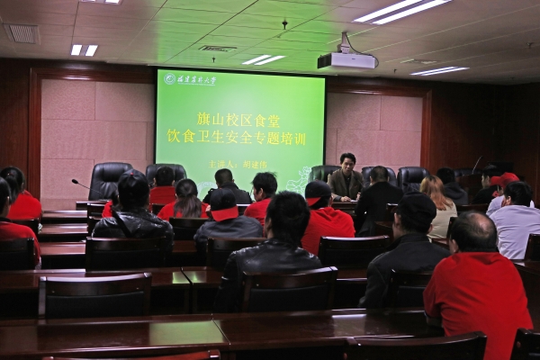 12月1日中午,旗山校区食堂饮食卫生安全专题培训在综合楼报告厅举行,培训由校区管委会副主任胡建伟主讲,校区食堂全体员工及后勤工作办公室相关工作人员参与了培训。