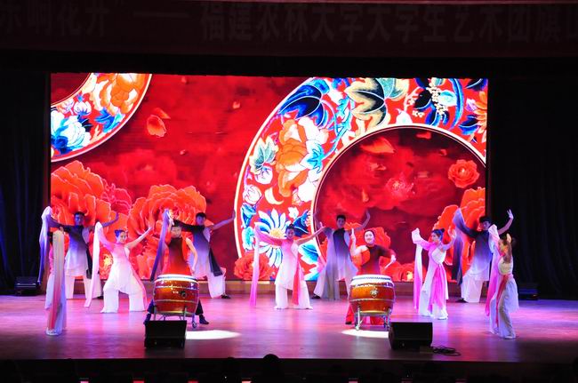 演出节目以中国传统文化为主要风格并融入现代潮流元素,涵盖了舞蹈、歌曲、乐器等多种艺术表现形式,为观众带来了一场视觉与听觉盛宴。演出在铿锵有力的鼓舞表演《鼓舞九天》中拉开帷幕;《剪纸姑娘》以俏皮的音乐、灵动的舞蹈,可人的装扮,生动地展示了剪纸姑娘们的可爱形象,令观众们拍手称绝;校园十佳歌手庄晓威同学演唱的《停格》、宋昕瑶同学演唱的《栅栏间隙偷窥你》,优美的歌声给师生带来美了的享受;古筝齐奏《战台风》、琵琶、排鼓二重奏《楚汉争霸》、弦乐四重奏《瑶族舞曲》、葫芦丝音画《月光下的凤尾竹》、二胡重奏《赛马》、器乐《茉莉花》,精彩演绎经典悠久的传统民族文化,让人如痴如醉;太鼓表演《火影》勾起了大家的青春回忆,瞬间燃爆全场;群舞《欢乐地跳吧》、街舞《BURN YOU UP》展现了青年大学生的青春活力,一次次将现场气氛推向高潮。