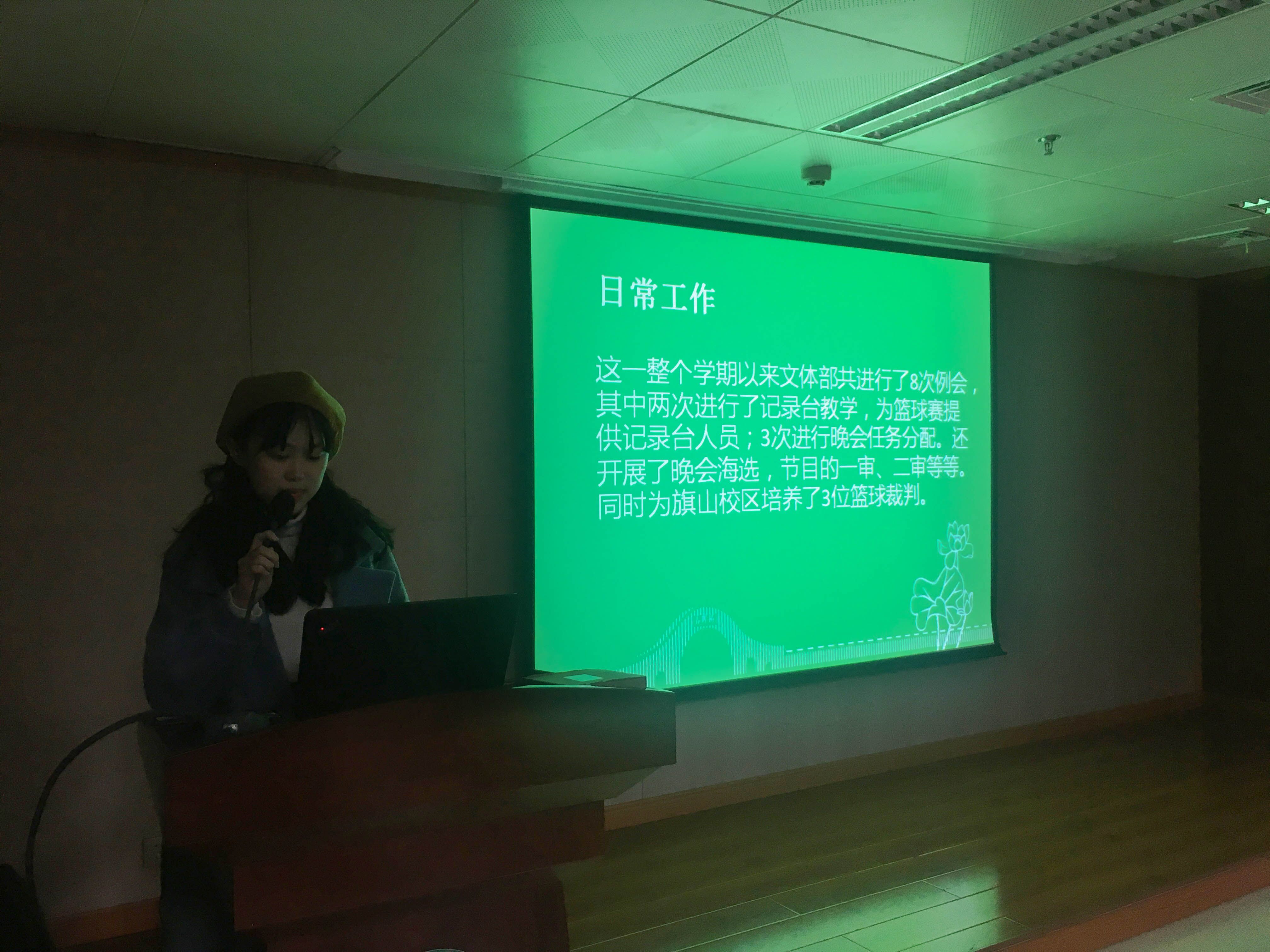 会上,各部门学生干部代表对本学期的工作进行总结,并展示了下学期的工作计划。学生会主席团分别对各自分管的工作进行汇报。学生会副主席李瑜佳总结了新年晚会成功举办所收获的经验,并提出各部门应加强调动成员积极性;副主席施正煌总结了本学期工作表现突出的外联部的工作,对下学期保卫部的工作进行规划;主席洪铭辉从总体上对学生会本学期的工作进行了总结,反思了各项工作中的不足并提出了提升方法。