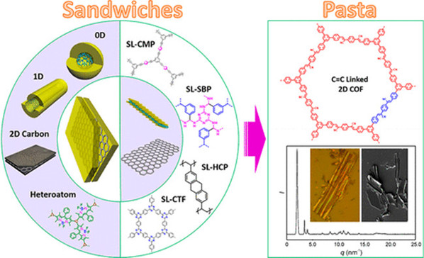 夹层2D多孔聚合物和多孔聚合物纳米片除了传统的单层原子和单体厚2D聚合物和层状结晶有机骨架外,还作为新型的2D软材料,在光电子和能源领域有着广泛的应用前景。2D模板是成功形成优良夹层2D多孔聚合物的极好方法,可控制纳米片的横向尺寸和垂直厚度,并可大量合成,通过热解可以直接制备多孔碳纳米片,以提高能量相关应用的导电性。2D模板法为多孔碳纳米片提供了良好的储能和电催化电化学性能。随着新型2D材料的出现,各种2D模板和单体可用于制备夹层多孔聚合物,用于特定的用途。