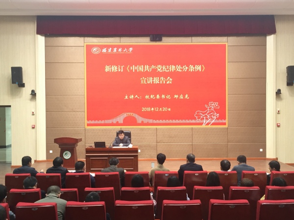 12月20日下午,校党委常委、纪委书记邱应龙在旗山校区小报告厅为旗山校区党员师生作《中国共产党纪律处分条例》(新修订)的宣讲报告,旗山校区管委会(筹)全体党员、材料工程学院、交通与土木工程学院党员师生代表共计百余人参加。