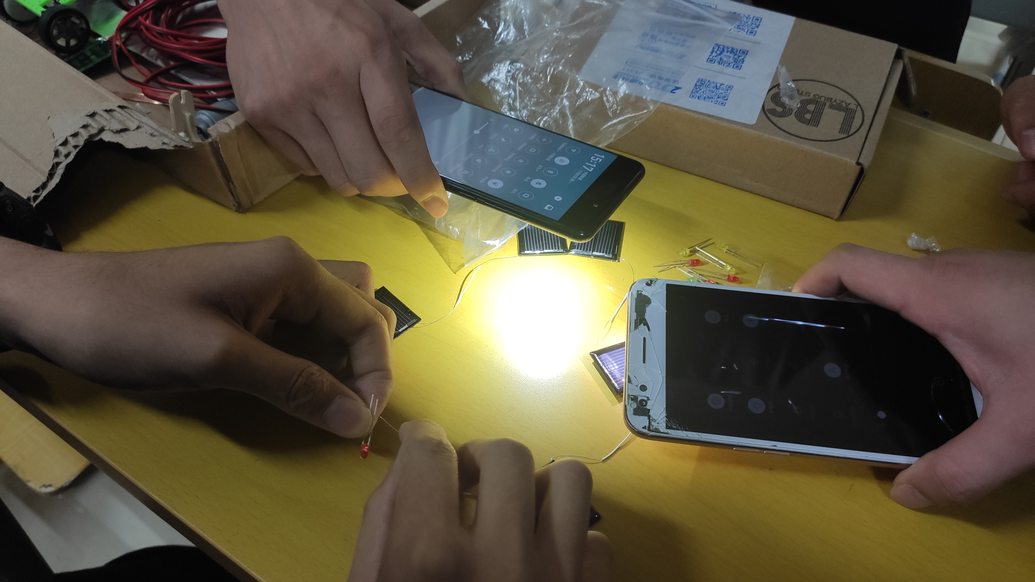 此次活动共包括三个部分。首先,同学代表去到实验室,和学长学姐一起制作小小的太阳能电池板。随后,全班同学在旗教105分成三组,每组搭建一座小房子,并安装上太阳能电池板使房子亮起来。