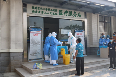 根据校区属地闽侯县防控办要求,校区将物业、保安、食堂、快递等从业人员全部纳入重点人群管理。5月9日,校区组织上街中心卫生院及福州博奥医学检验所到校区医疗服务站为校区从业人员免费进行新冠病毒核酸检测,首批共110人参加检测,检测结果全部为阴性。后续还将根据校区复学复工实际继续开展核酸检测。