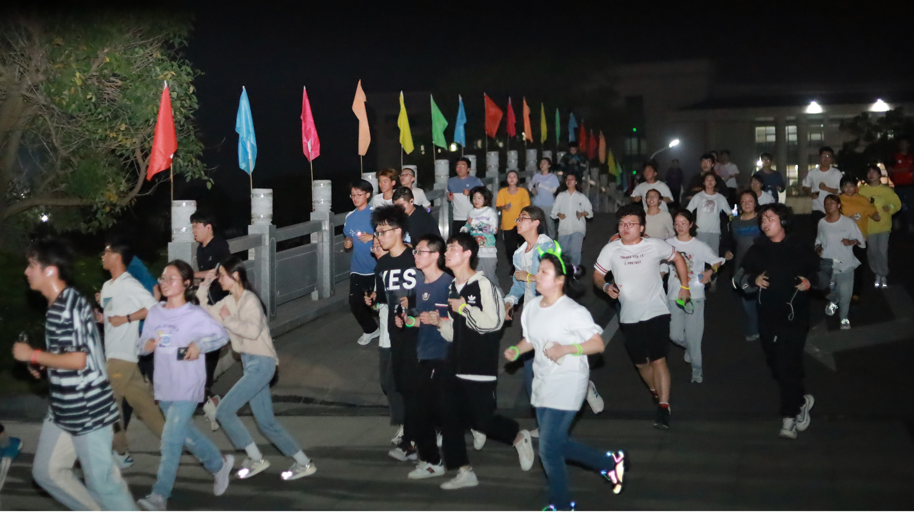 当日晚七点半,荧光夜跑活动正式开始,在工作人员的提醒下大家打开记步软件,跟随领跑者开始绕校一圈的夜跑。期间同学们在志愿者的指挥和地面荧光粉的引导下有序前行,安全地完成了本次荧光夜跑活动。