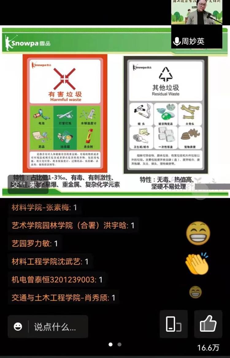 2月23日晚上,旗山校区再次举办生活垃圾分类培训讲座,本场讲座采用线上形式进行,邀请校外专职培训师周妙英主讲,旗山校区师生员工共4500余人参加。周老师从垃圾分类的背景和意义、生活垃圾分类知识、规范分类投放收集贮存和个人低碳生活建议等四方面,对垃圾分类进行了深入浅出的宣讲。