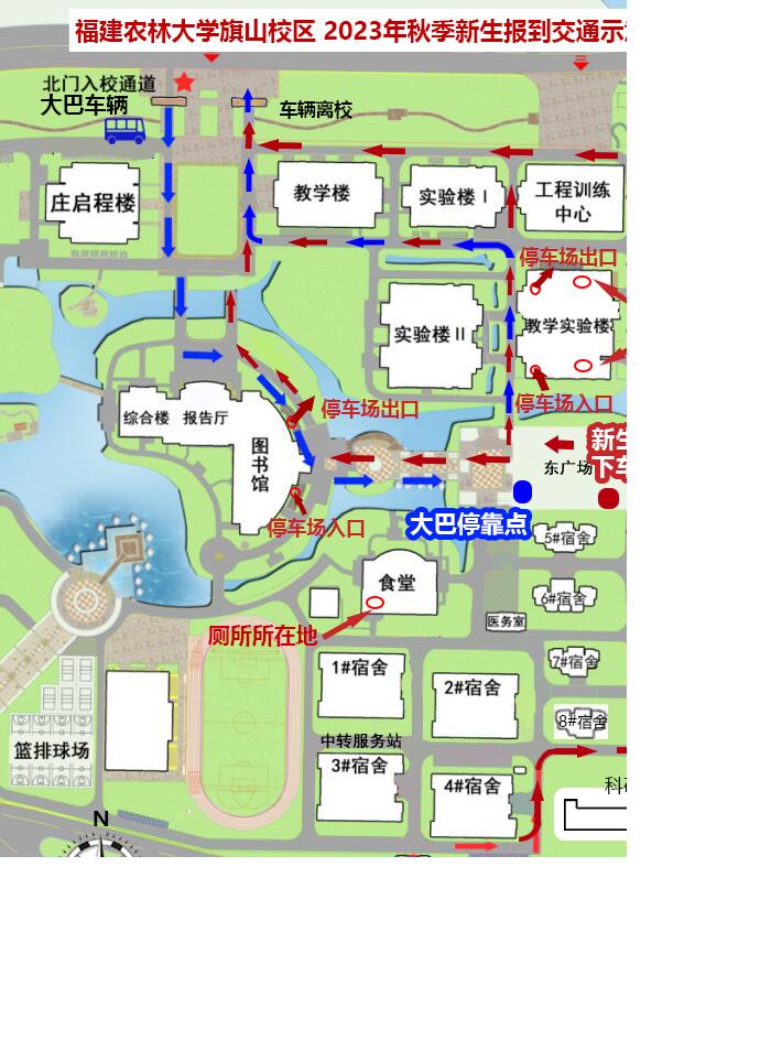 二、迎新专用车辆:从北门进口进校,根据现场指示牌和工作人员引导,沿着指定线路行驶至东广场西侧孔子像前,待新生下车后,继续沿着指定线路从北门出口驶出校区。